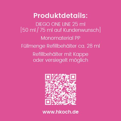 Der DIEGO ONE LINE REFILL Stick ist derzeit in der 25 ml-Ausführung erhältlich. Volumen von 50 ml oder 75 ml sind auf Kundenwunsch möglich. Der Refillbehälter verfügt über eine Füllmenge von 28 ml und kann wahlweise mit Kappe oder versiegelt geliefert werden.