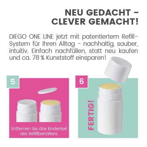 Mit dem DIEGO ONE LINE REFILL präsentieren wir Ihnen ein innovatives, patentiertes System für wiederbefüllbare Sticks – speziell entwickelt für feste Formulierungen. Dieses Konzept setzt neue Maßstäbe in puncto Nachhaltigkeit, Ressourceneffizienz und Bedienkomfort.