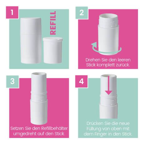 Die Anwendung ist ebenso einfach wie genial: Der Refillbehälter wird einfach umgedreht auf den leeren Stick gesetzt. Anschließend wird der Inhalt mit leichtem Druck nach unten in die Außenhülse geschoben – fertig. Kein Werkzeug, kein Aufwand, kein Risiko – nur ein smarter, intuitiver und nachhaltiger Nachfüllprozess.